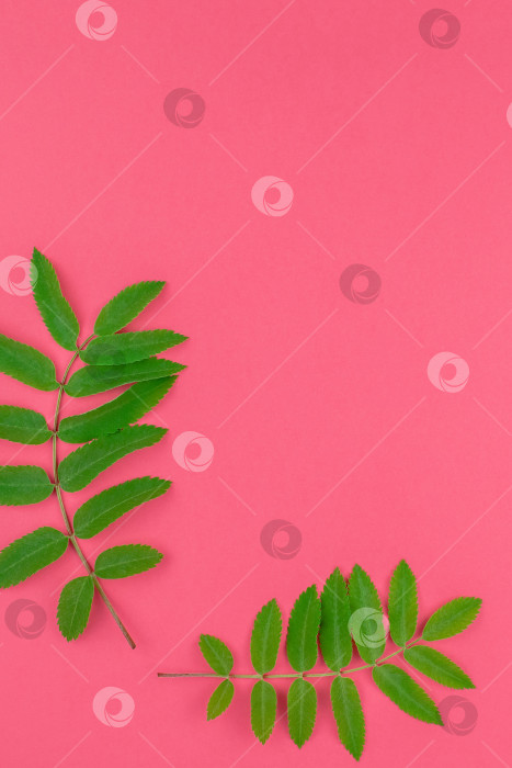 Скачать Зеленые листья рябины на ярко-розовом фоне фотосток Ozero
