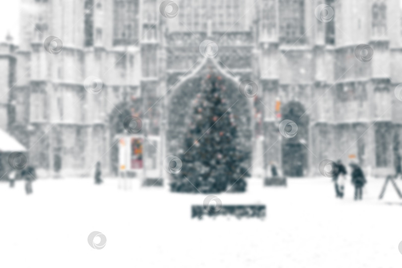 снежная буря в городе: уличная сцена с рождественской елкой и кафедральным собором. Размытый фон с расфокусировкой
