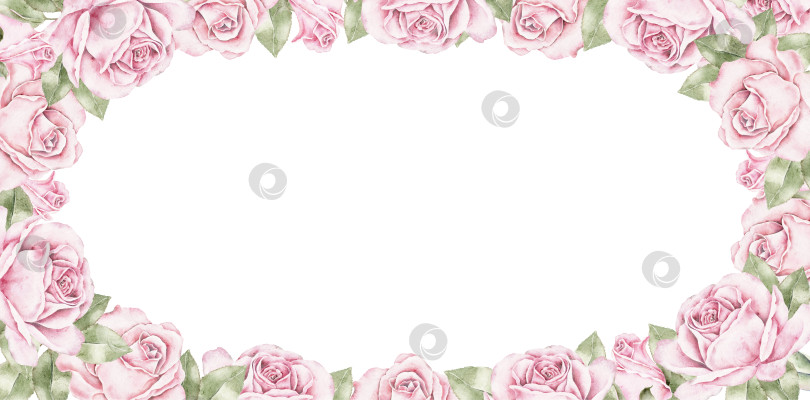 Горизонтальная акварельная рамка с розовыми розами, образующими овал в центре. Элегантная цветочная иллюстрация идеально подходит для поздравительных открыток на День Святого Валентина, свадебных приглашений или романтических канцелярских принадлежностей.