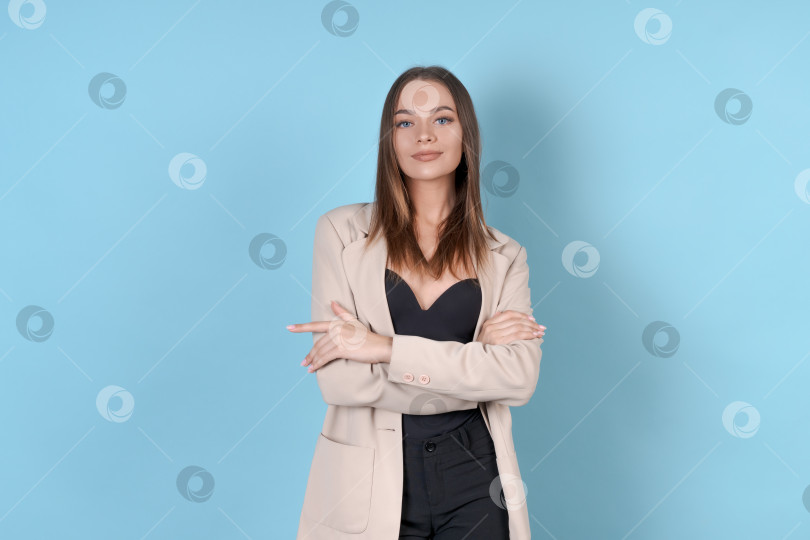 Молодая деловая женщина улыбается в камеру. Портрет красивой счастливой молодой женщины, стоящей со скрещенными руками и смотрящей в камеру на синем фоне. Эмоциональная концепция