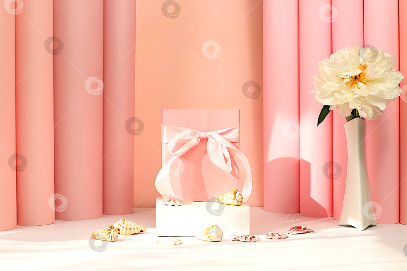 Сцена для демонстрации продукции и бизнес-концепция для продвижения покупок. Пустой подиум премиум-класса с подарочными коробками. Красивая цветочная композиция с пионами, элегантная концепция красоты, минималистичная современная эстетика,