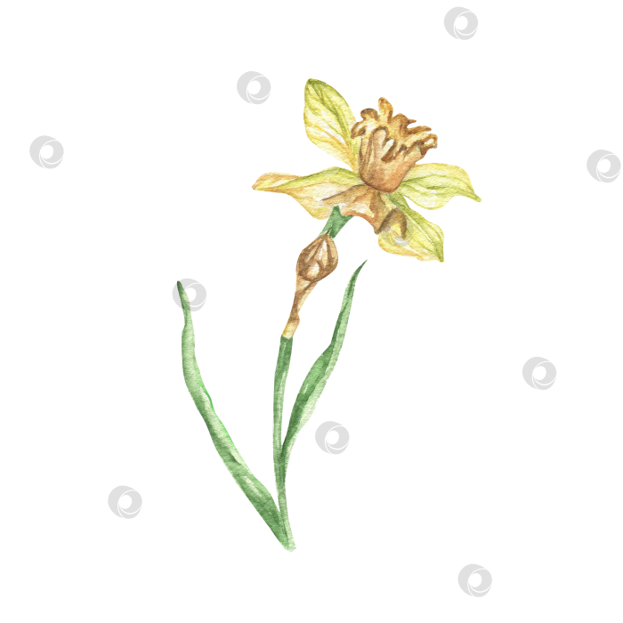 Акварельная иллюстрация нежного желтого нарцисса с зелеными листьями, идеально подходящая для оформления в ботанической и цветочной тематике. Весенний цветок, нарисованный вручную акварелью