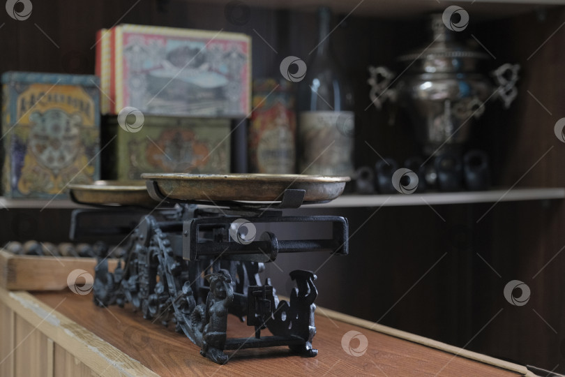 Златоуст, Россия - 20 июня 2023 года: Старинные торговые весы из чугуна и латуни с изображением русалок. Изготовлены на фабрике А. Кржиковского, Варшава, 1879-1920 годы.