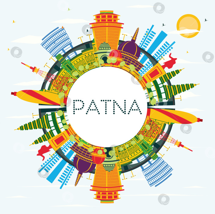 Горизонт индийского города Патна с цветными зданиями, голубым небом и пространством для копирования. векторная иллюстрация. Концепция деловых поездок и туризма в сочетании с современной архитектурой. Городской пейзаж Патны с достопримечательностями.