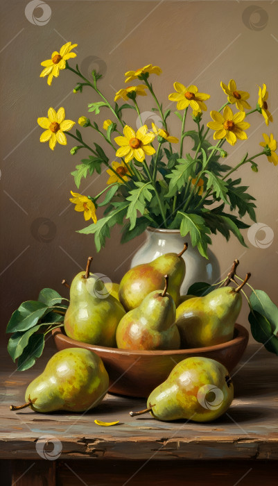 Вертикальный натюрморт с желтыми цветами в вазе и зелеными грушами в деревянной тарелке. Масляная живопись, арт.