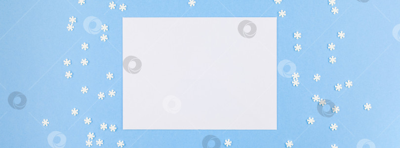Креативный вид сверху на плоскую зимнюю рамку. Концептуальный макет, выполненный из маленьких белых снежинок, конверт для писем на пастельно-голубом фоне, копирующий шаблон в стиле минимализма, пригласительные открытки, длинный широкий баннер