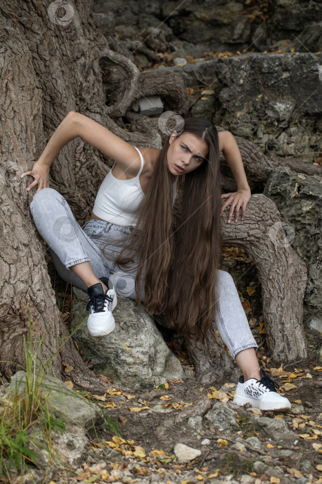 Молодая красивая девушка в серых джинсах позирует на берегу у корней большого дерева