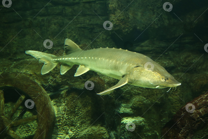 Осетровые рыбы (калуга, белуга) плавают на дне аквариума. Рыбы под водой