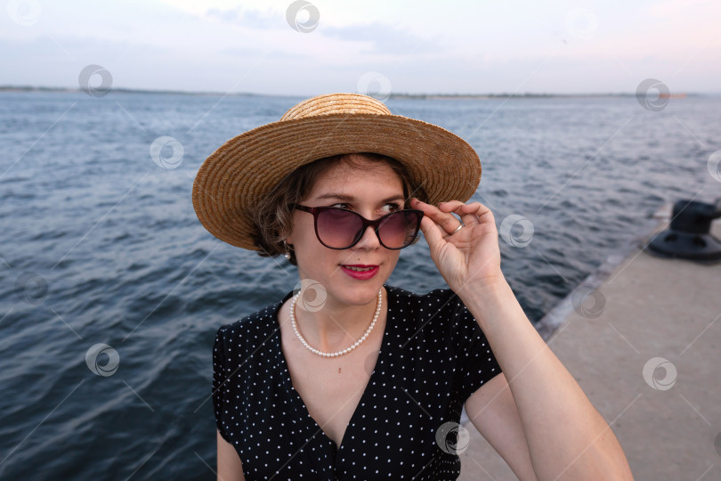 Крупный план женщины в шляпе и жемчугах, поправляющей солнцезащитные очки.