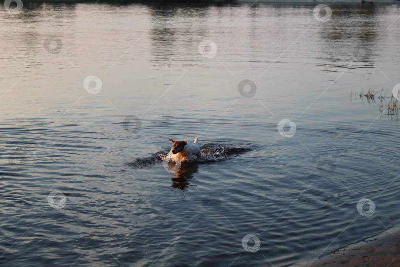 Собака породы Джек Рассел в воде подплывает к берегу. Как купаются животные. Опасные водоемы для человека и животных.