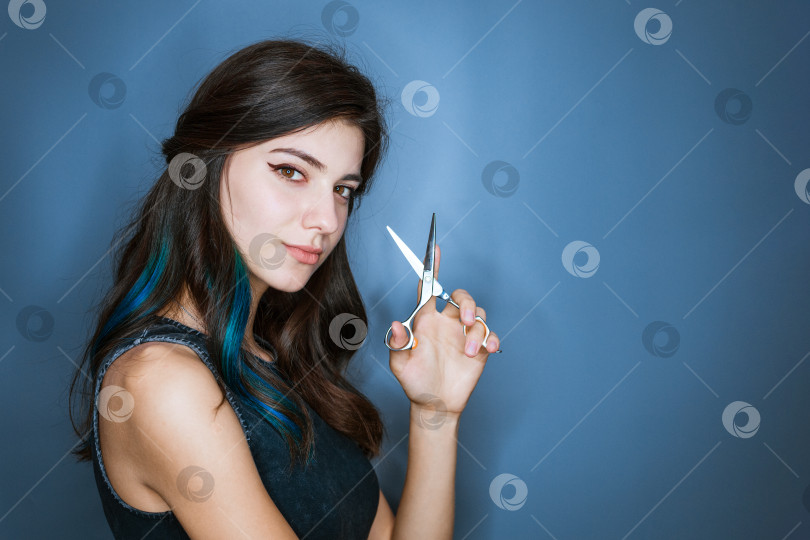 Красивая брюнетка с улыбкой подстригает длинные волосы ножницами на синем фоне. Счастливая девушка