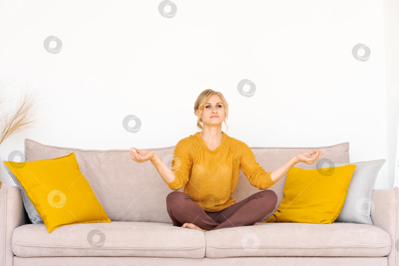 Спокойная белая женщина, сидящая на диване в гостиной, практикующая йогу, снимает негативные эмоции, рациональная милая женщина, медитирующая дома на диване, дышащая свежим воздухом, концепция отсутствия стресса