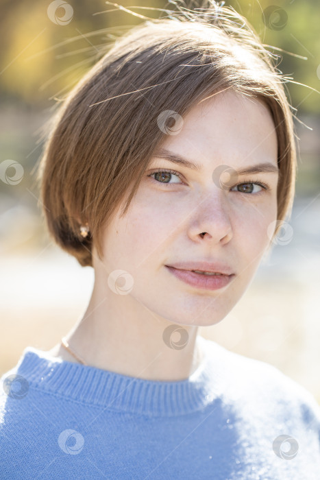 Портрет молодой красивой женщины в синем шерстяном свитере