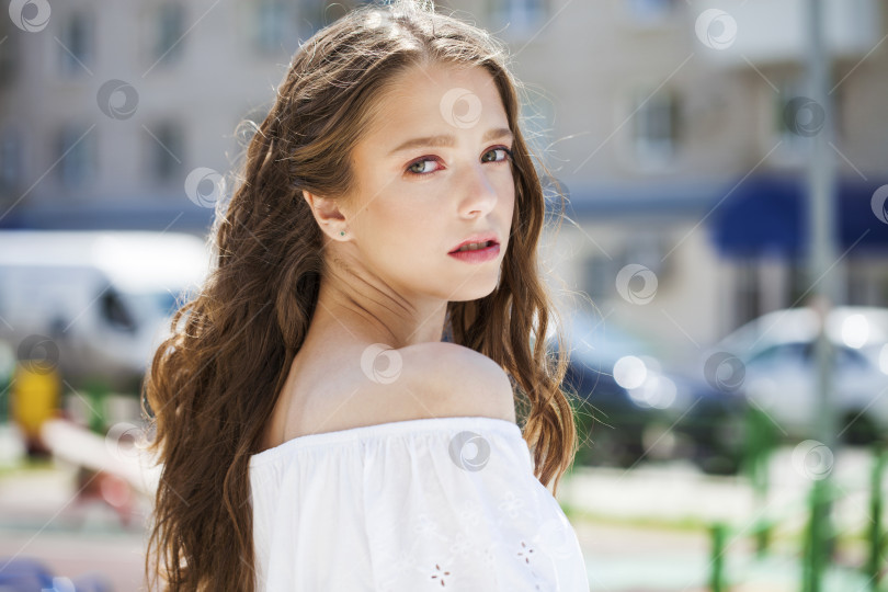 Сделай макияж красивому лицу. Портрет молодой красивой брюнетки крупным планом на летней улице на открытом воздухе