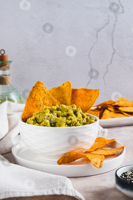 Тарелка с гуакамоле и мексиканскими чипсами начос на тарелке на столе, вид сверху