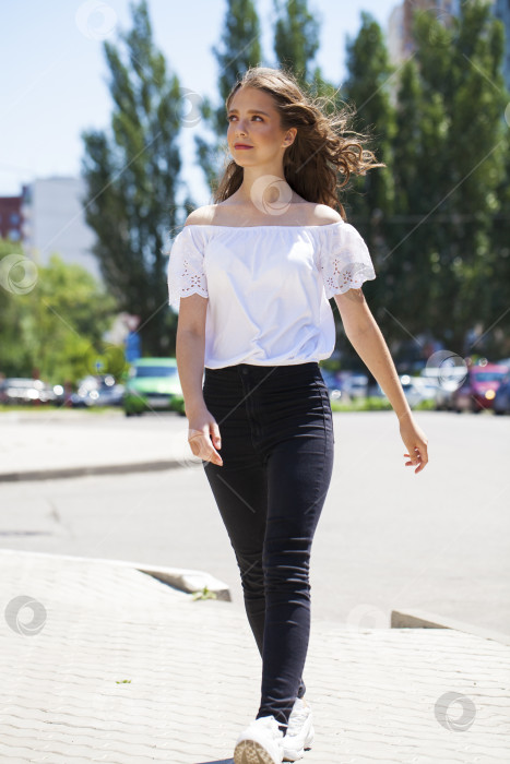 Молодая модель в полный рост. Портрет молодой красивой брюнетки в джинсах и белой блузке, идущей по летней улице