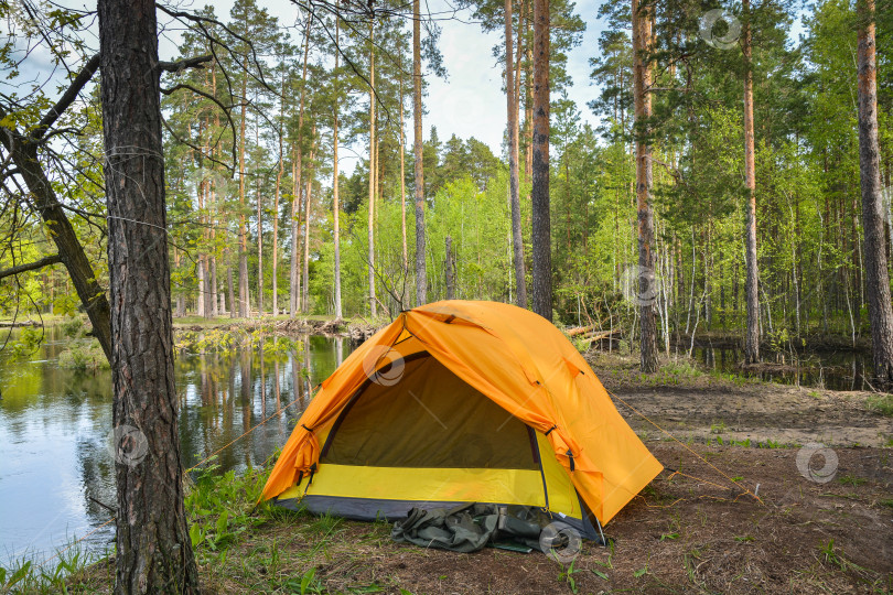 Желтая палатка на берегу лесной реки. Весенняя поездка в национальный парк.
