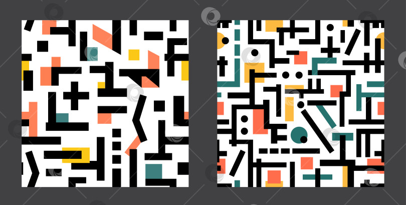 Набор ярких абстрактных современных бесшовных узоров в стиле геометрии и кубизма. Дизайн для упаковки, фонов, печати на ткани и текстильных изделиях в экстравагантном стиле, для детей и праздников