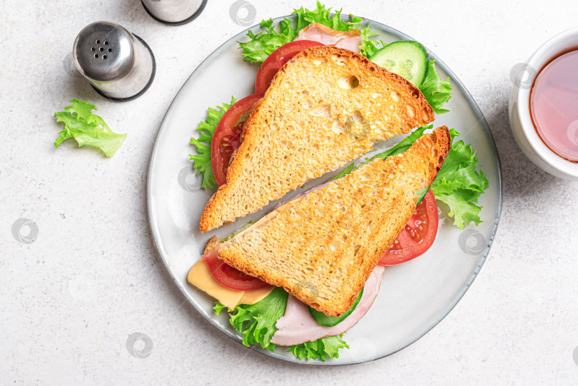 Разрезанный пополам клубный сэндвич и чашка чая на белом фоне. Сэндвич с ветчиной и сыром чеддер с овощами и листьями салата - полезный обед.