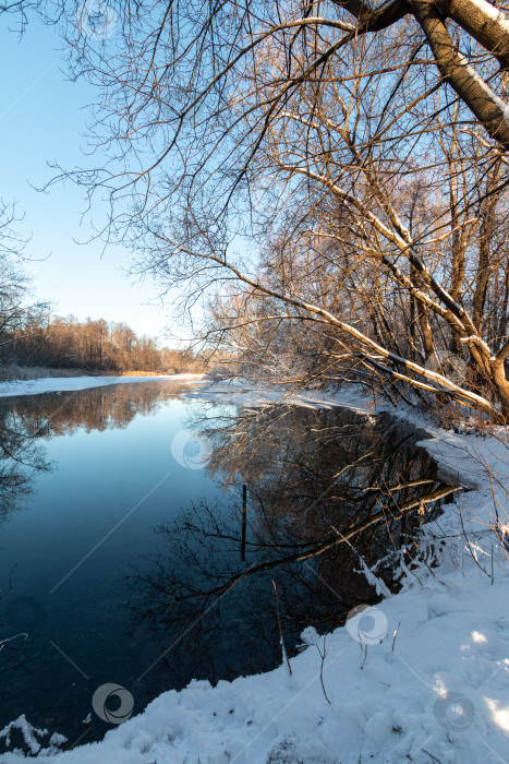 замерзшие деревья на берегу озера в зимний солнечный день, фотография природы